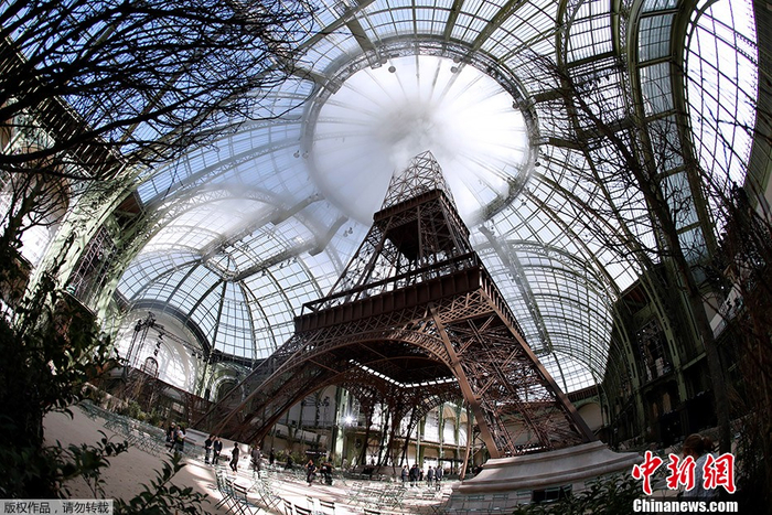 当地时间2017年7月4日,法国巴黎,香奈儿2017-2018年秋冬高级定制时装系列在巴黎大皇宫举行,图为埃菲尔铁塔的复制品。