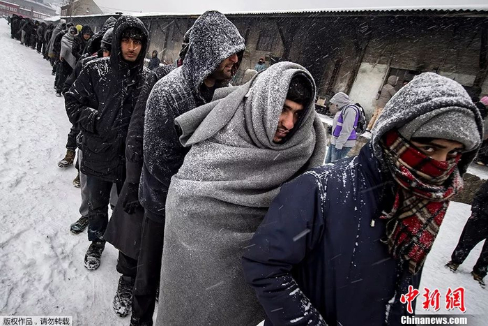 当地时间2017年1月11日,塞尔维亚贝尔格莱德,移民在临时居住的废弃仓库外排队领取志愿者发放的食物。一夜之间气温已降至零下15摄氏度。最新的数据显示,大约有7000名移民被困在塞尔维亚。