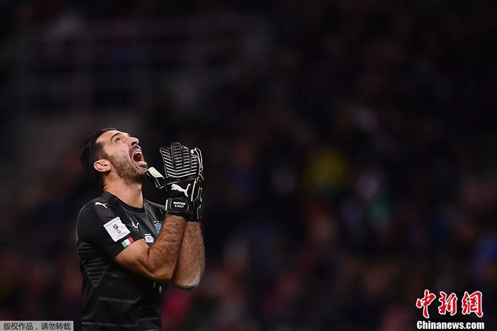 当地时间2017年11月13日,意大利米兰,意大利门将布冯在2018年世界杯预选赛对战瑞典的比赛中。