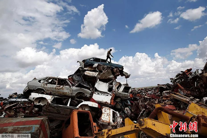 当地时间2017年4月3日,伊拉克摩苏尔,一名男子在车辆废墟中行走,其中一些曾被用作路障,堆放在摩苏尔西部的一个垃圾场。