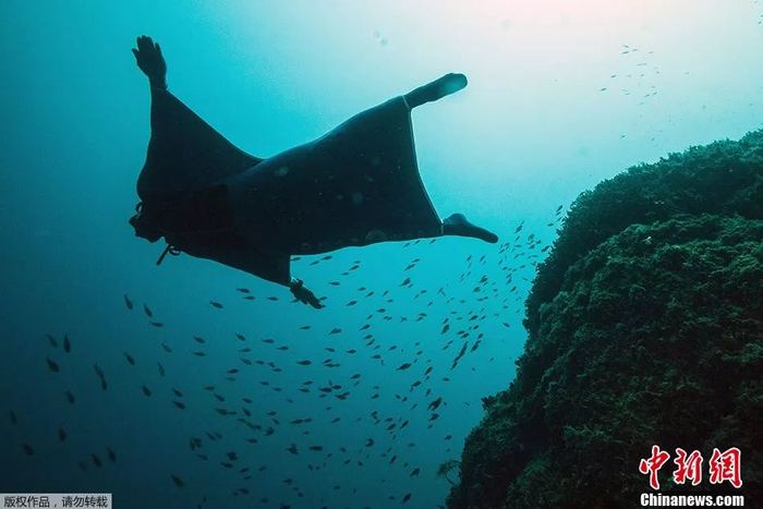 当地时间2017年8月13日,摩纳哥地中海海岸,摩纳哥自由潜水者Pierre Frolla穿着“海洋之翼”潜水服潜水。