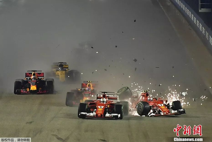 当地时间2017年9月17日,新加坡,F1新加坡大奖赛上,法拉利芬兰车手基米·莱科宁(右)的赛车发生事故。