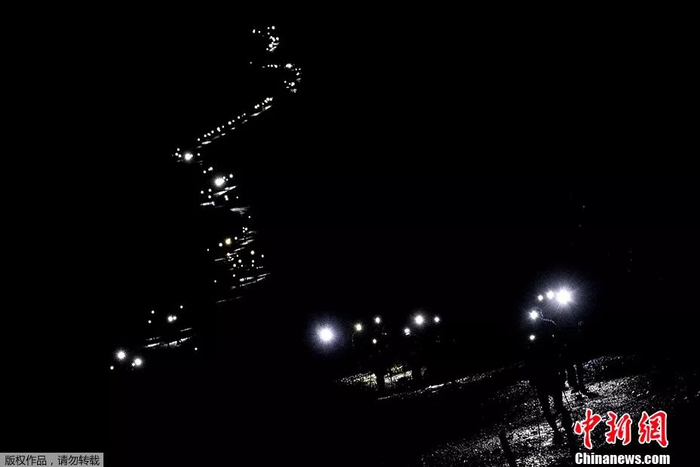 当地时间2017年9月1日,法国Les Contamines Montjoie,环勃朗峰超级越野耐力赛举行,灯光照亮公路。