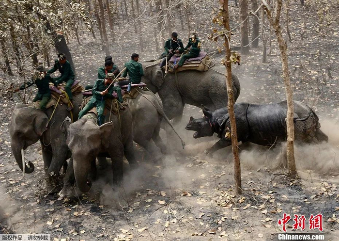 当地时间2017年4月4日,尼泊尔Shuklaphanta国家公园,被重新安置的犀牛释放后冲向工作人员。