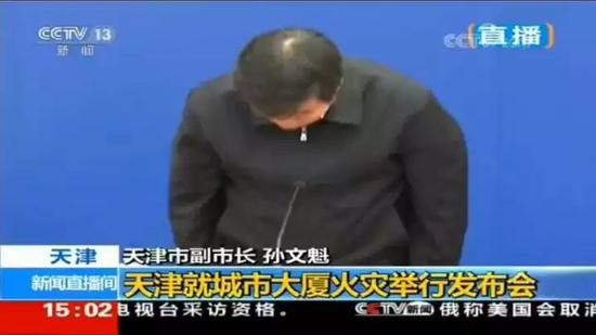 今天下午3时,天津就城市大厦火灾举行发布会,在发布会现场,天津副市长孙文魁、天津河西区区长李学义就天津大火鞠躬道歉。