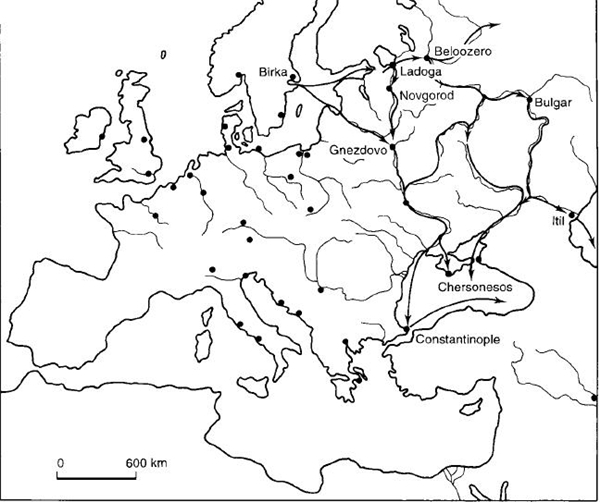 为了到达君士坦丁堡,瑞典人需要从北向南穿越整个东欧平原。好在这里河流纵横,整个地区形如一张河流交织而成的网。对惯于在水上活动的维京人来说,这是得天独厚的有利条件。他们往往从北欧航行到芬兰湾今圣彼得堡所在地一带,然后顺着涅瓦河航行大约30英里,进入拉多加湖,再顺着湖岸航行,进入沃尔霍夫河。随后经由第聂伯河进入黑海直抵君士坦丁堡。