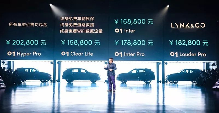 刚刚结束的广州车展期间,领克01以预售价17万—24万元开启预定,137秒内6201辆领克01就已售罄,刷新了中国网络售车的纪录。领克01上市的四种风格量产车型分别命名为“纯、型、耀、劲”,给年轻客户群体更加个性化的选择。最终价格区间为15.88万元-20.28万元,同时还推出了一款时间限量版,价格为22.08万元。