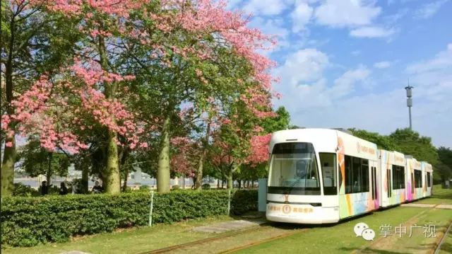 △有轨电车穿梭于异木棉花海