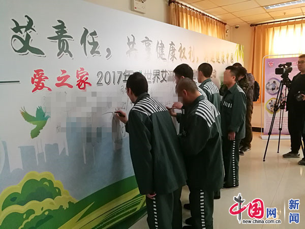 在利康教育矫治所举行的第30个世界艾滋病日宣传活动中HIV感染者签名承诺“坚决做到艾滋病到我为止”。