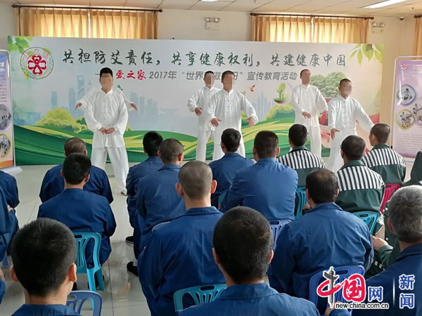 在利康教育矫治所举行的第30个世界艾滋病日宣传活动中,HIV感染者表演了八段锦。