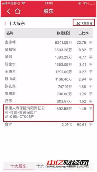 3、2017年4月至三季报公布时,泰康人寿成为第十大股东。