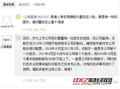 江南嘉捷也在上证e互动平台上证明泰康人寿并非突击入股。