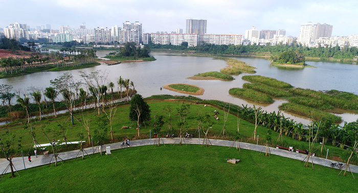 海口的水体治理也在践行侯立安提出的这些理念。海口将治水融入生态修复,运用海绵城市的建设理念。河道两边的绿带空间构建起“渗、滞、蓄、净、用、排”六位一体效果,在洪水来临时能够发挥治蓄与增强排涝的功能。目前,美舍河综合治理项目一期5个示范段基本完工,岸上树木、河中水草,鸟儿欢鸣、鱼儿嬉戏的景象重现。而凤翔湿地公园更为城市居民提供优质的生态空间,成为周边居民休闲的好去处。公园在提升水体环境的同时,完善基础设施,带动水系周边土地的综合利用及价值提升,实现生态效益、社会效益、经济效益的有机会结合,充分体现以人民为中心的发展思想。