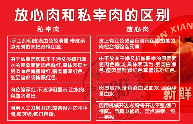 此外,从定点屠宰厂出来的猪肉表皮盖有生猪检疫合格章和红色的品质检验合格章,而私宰肉大多没有盖公章。