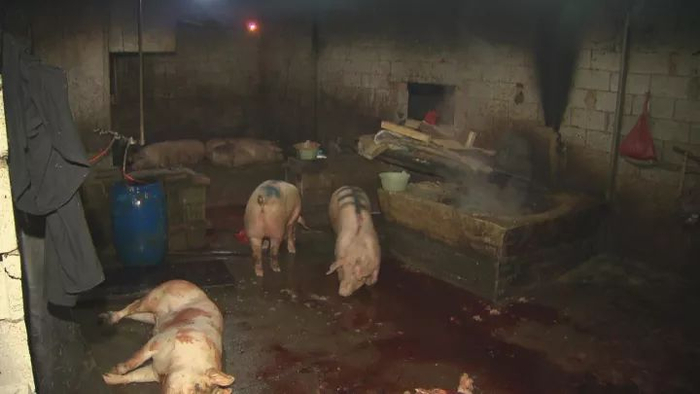 私宰点为了投入低成本创造高收益,卫生条件往往难以达到要求,临时搭建一个简易窝棚,铺好水泥地板,架一口铁锅,就进行私宰。