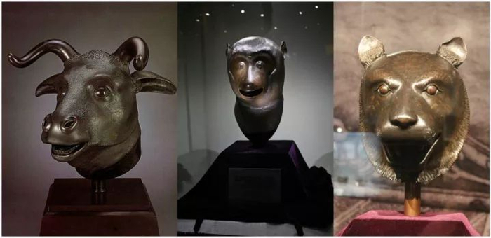 ▲圆明园12生肖兽首铜像中的牛首、猴首、虎首
