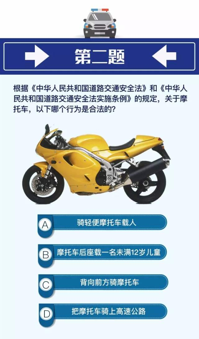 根据相关法规,轻便摩托车(50cc排量以下)不允许载人,摩托车不能载未满12周岁的未成年人,当然更不能为了摆酷去倒骑。不过,把摩托车开上高速,在一些省市是允许的。在骑摩托上高速之前,还是需要了解当地具体规定。