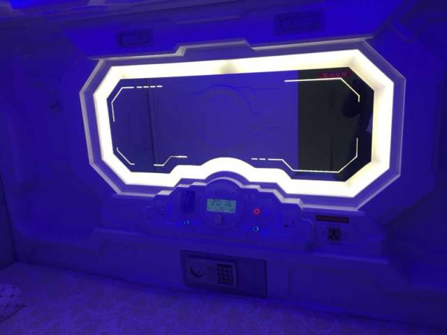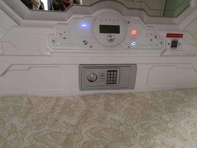 睡眠舱分为5个区(包含52个睡舱),分别以天缘、友缘、良缘、佳缘、团缘命名。太空舱酒店的睡眠舱分为上下层,每个睡眠舱都是一个独立的房间,每个房间都要使用各自的智能芯片才能开启,为广大旅客提供了安全、私密的住宿空间。睡舱内径长2米,高1.1米,电视、梳妆台、折叠式迷你台桌、WIFI等设施一应俱全,而且床上用品采用了记忆棉材质,整体住宿环境舒适而不失空间。