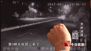 但在第三辆车亮起刹车灯,向左避让后,后面紧跟着的第四辆车才亮起刹车灯,这时可以看到灯光有上下抖动的轨迹。一般正常行驶的一辆车,灯光是不动的。但是如果这辆车轧到了什么凸出物的话,灯光就会有一个上下运动的轨迹。