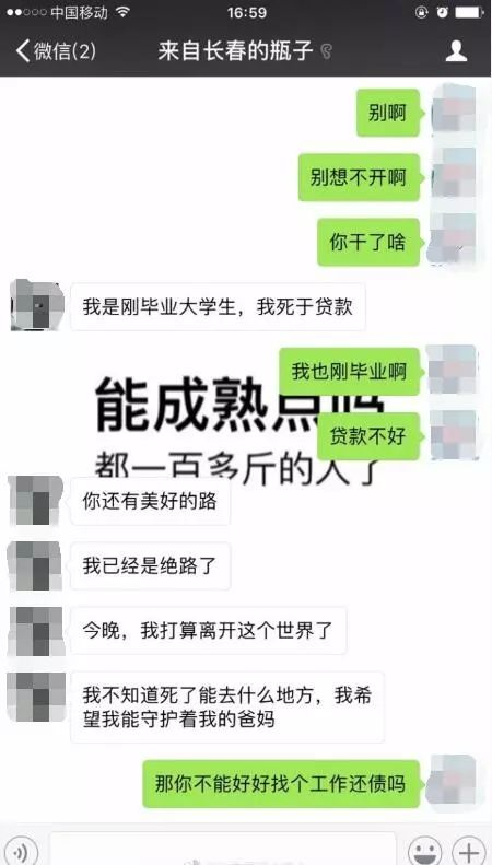 微博下方附带3张聊天记录截屏,内容显示,一位长春小伙子刚刚大学毕业,目前背上了巨额贷款无力偿还,想要在当晚自杀离开这个世界。