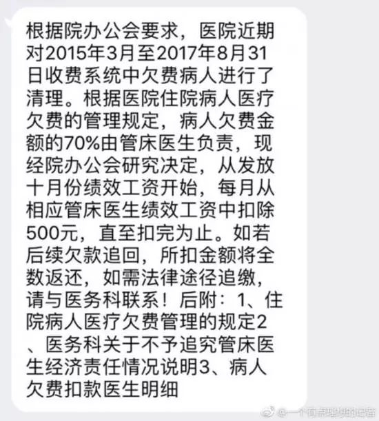 据了解,这是江苏省连云港市赣榆区人民医院追讨病人欠款的方式,规定要求病人欠费金额的70%由主管医生负责,将从10月起每月从医生当月绩效中扣除500元,直至扣完为止。赣榆区人民医院院办一位工作人员表示,病人欠款医生承担只是一种激励措施,医院还有多种追讨渠道。