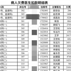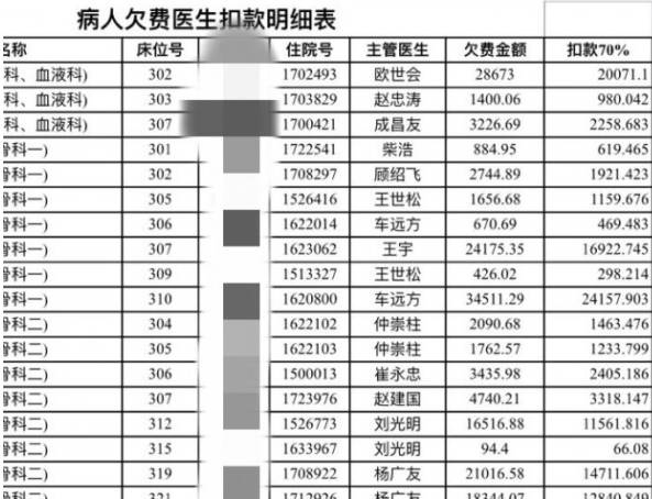 记者从网上曝光的一份“扣款明细表”中看到,该表涉及医生39位,医生扣款金额从数十元到数万元不等,其中需要扣费最多的是一位普外科医生,其收治病患共欠款18万余元,按照医生承担70%计算,该医生需要扣款12万7千余元,如果每月扣款500元,共计20年才能扣完这笔欠款。
