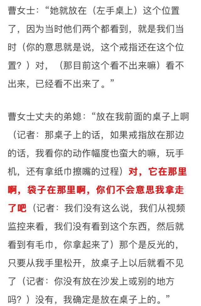 曹女士:“现在她吃东西,戒指就不在她手上,她就放桌子上了。”