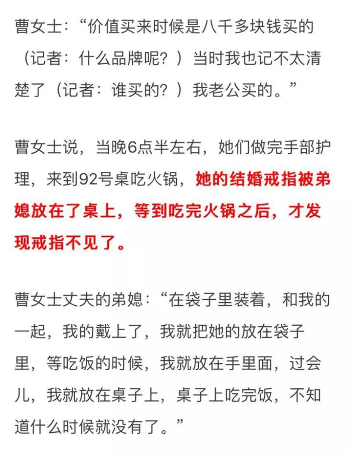 这个时候,曹女士离开去拿火锅调料,她弟媳先是左手戴了一枚戒指,然后右手戴了两枚。