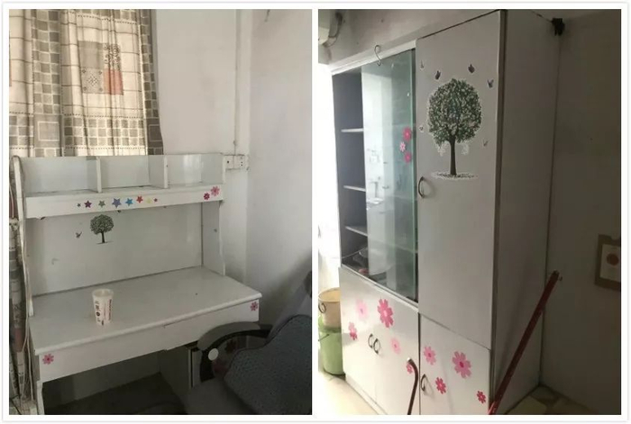 床依然是一米二那种。椅子终于不是小红凳了,也配了一张学习桌。