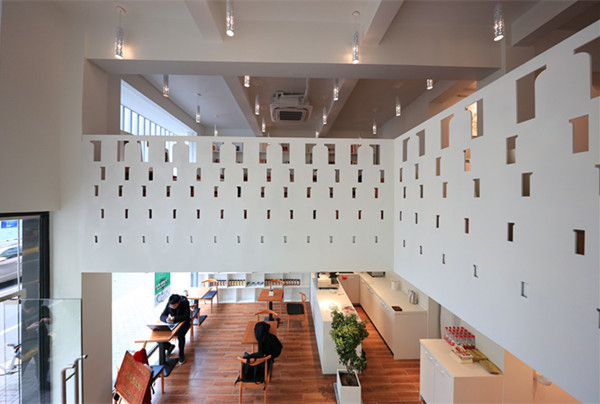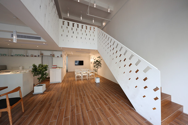改造后的空间保留了原先有历史痕迹的木地板,新的空间设计以简洁的白色为主色调,但在镂空的扶梯把手和吊灯等细节之处都嵌入了石库门元素。