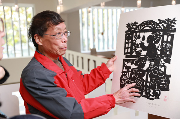 华兴富展示自己以老上海石库门生活为主题的撕纸作品。