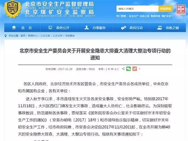 据了解,11月20日,北京市安全生产监督管理局发出《北京市安全生产委员会关于开展安全隐患大排查大清理大整治专项行动的通知》,仓储物流被列为了清理整治重点区域。通知指出,从11月20日开始至12月底,北京市将集中40天开展安全隐患大排查、大清理、大整治专项行动。