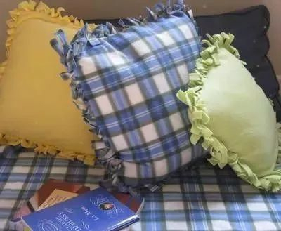 需要准备,一大块布料,四个枕芯,一把剪刀,针线