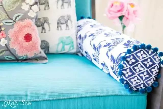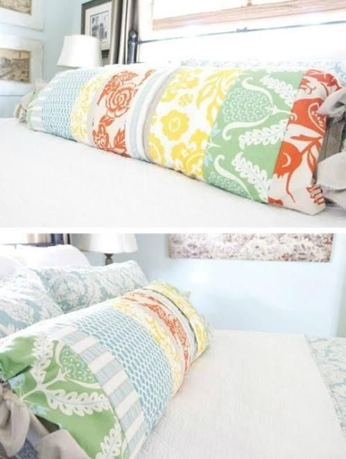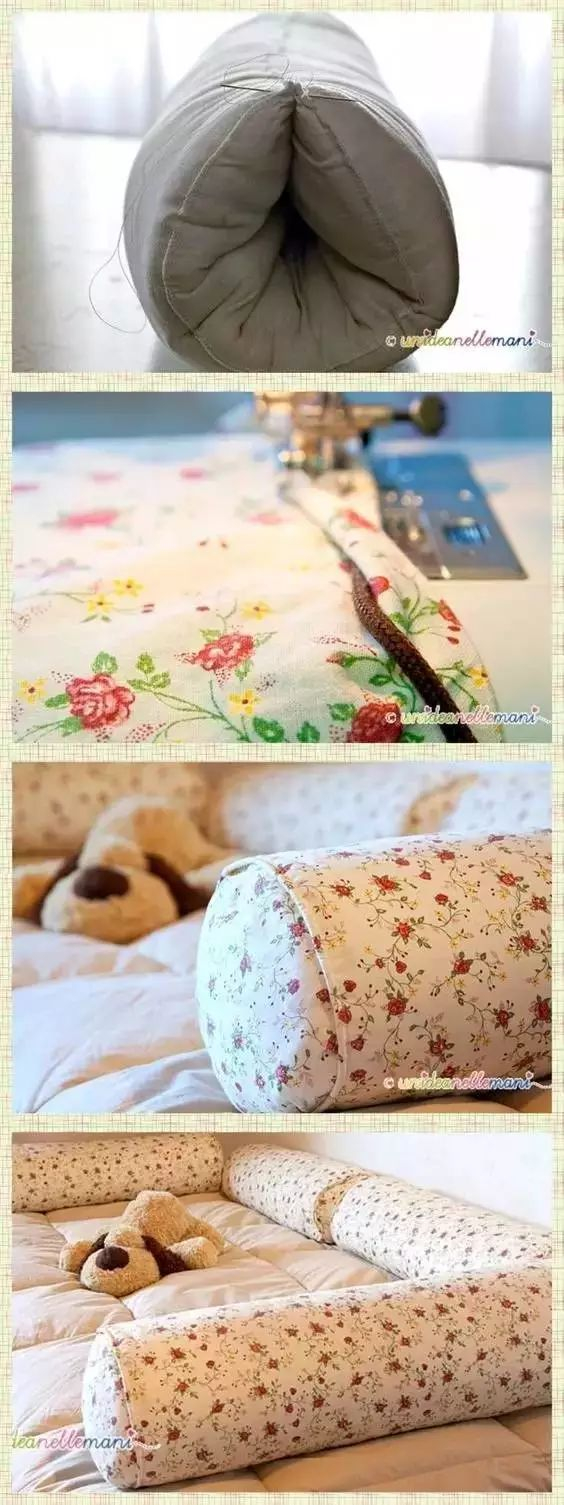 这个沙发垫可不同以往,放在旁边的圆柱形靠垫,将枕头两边缝制在一起,做好一个适合大小的枕套,可以放在沙发两边,也可以放在床边挡墙和床缝,也可以放在孩子的床边,喜欢长一些的也可以将两个缝在一起。