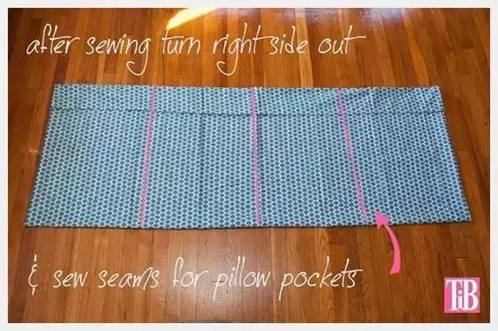放好后将没有放枕头的一端拉起盖在枕头上。将下面的一边沿枕头边缝制好,要注意这个时候布料是反着的
