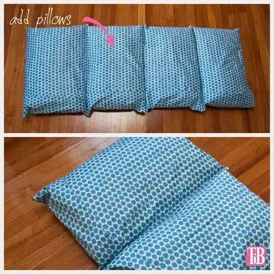 外出时偶尔会在车上睡一小觉,这个时候怎么都不会那么舒服,尤其是坐在后面的孩子,觉得安全带很方便,做个这样的东西,就会让外出的在车上睡觉舒服很多。下面这个其实很简单,一个枕头取出一些填充棉,而后将剩余填充棉分别推向两边,分好后车缝两条直线在图中位置就可以了,是不是很方便?