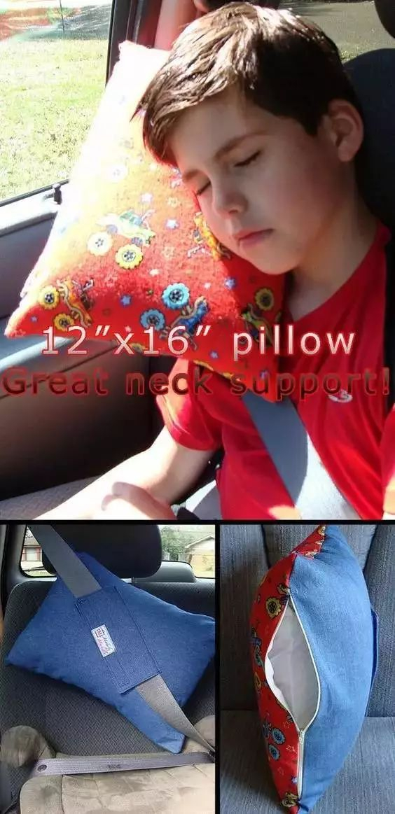 还有一种就像下面这样,在枕头的另一端做好一个互搭的粘扣,将安全带固定在粘扣里,便可以轻松的让孩子在车上睡了,而且不会那么容易出现歪脖子很难受的样子了,安全带也会勒出印子。