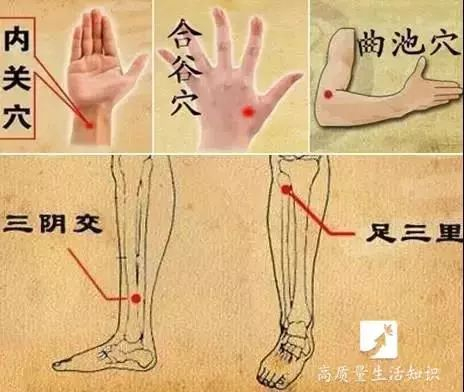 取足三里、三阴交、曲池、合谷、内关五个穴位,每个穴位用大拇指按揉,每个穴位按摩一分钟,两侧都要按到。
