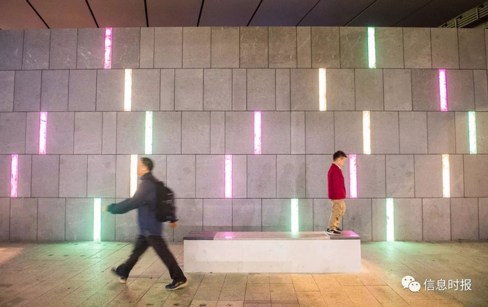 黄埔立交桥公交车站后面的艺术墙, 晚上的 LED 灯发出各种色彩的光芒。信息时报记者 陆明杰 摄