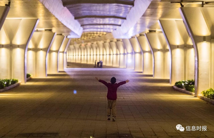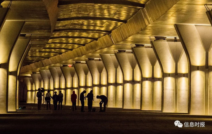 夜幕降临,猎德大桥南桥底的 LED 壁灯亮起,俨然变成了一条发光的长廊。 刚刚完成 MV 拍摄的年轻人,正在收拾拍摄设备。信息时报记者 陆明杰 摄