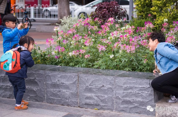 一名老人在花丛旁边蹲下身,让小朋友帮她拍照。信息时报记者 陆明杰 摄