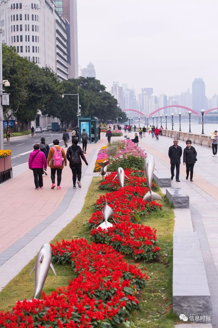沿江西路上,海豚、海鸥的造型雕塑在新的花丛中显得更有灵气。信息时报记者 陆明杰 摄