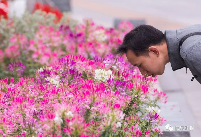 看着这些在寒冷天气里盛开的娇艳花朵,一名男子忍不住停住匆匆的脚步,俯身一闻芬芳。信息时报记者 陆明杰 摄