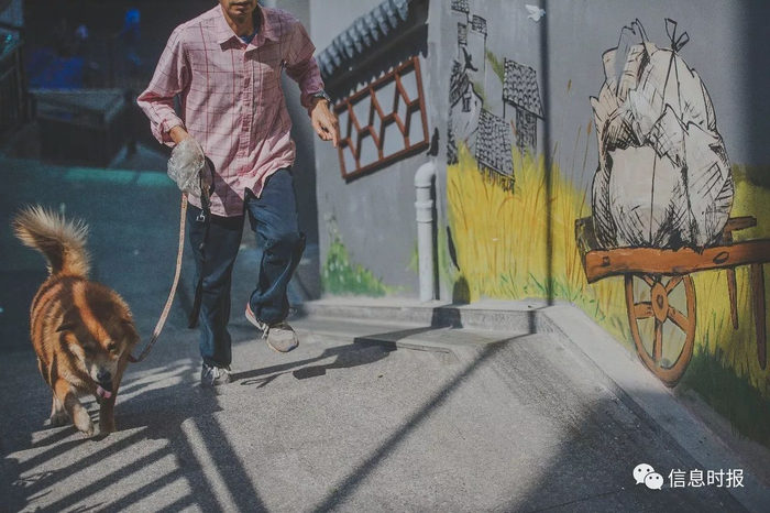 淘金农贸市场通往华侨新村的楼梯旁, 改造后墙壁被重新粉刷,添上了涂鸦。一市民拉着金毛犬跑上楼梯,与画中拉着满车稻谷的农民“并驾齐驱”,相映成趣。信息时报记者 梁钜聪 摄