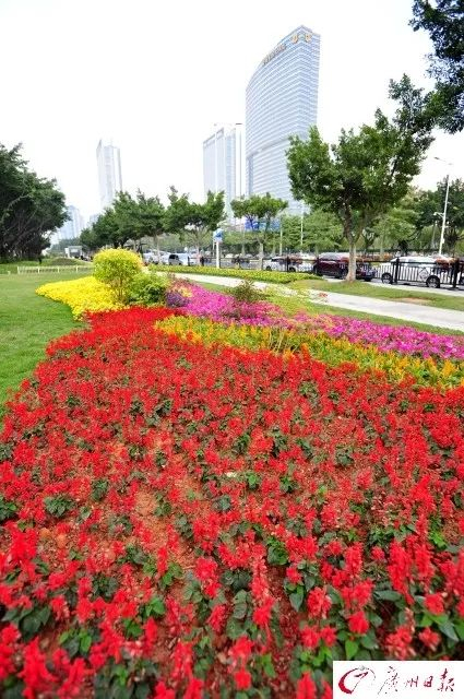 阅江路的绿化带上繁花似锦美丽非常。广州日报全媒体记者 杨耀烨 摄