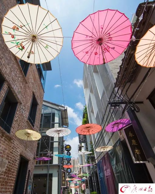 永庆坊内,行人和花伞相映成画。广州日报全媒体记者陈忧子 摄