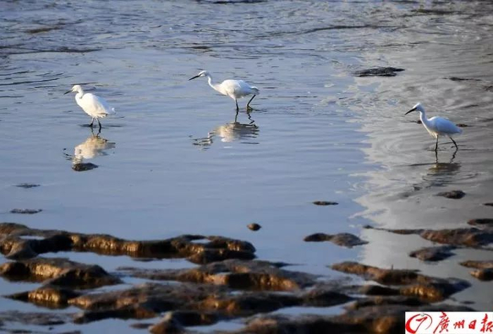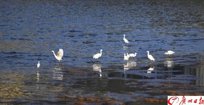 猎德大桥旁的珠江里一群白鹭时而觅食时而翩翩起舞,而身后是繁华的珠江新城CBD。广州全媒体记者 王燕 摄