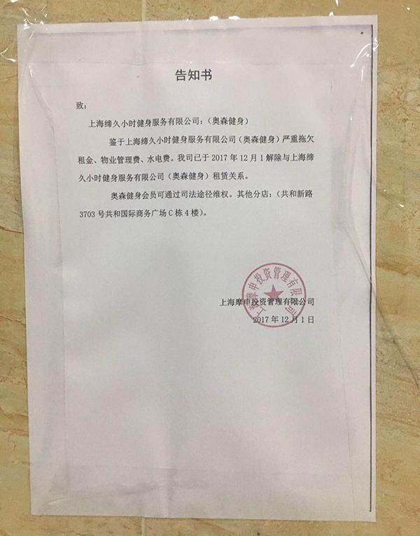 在这栋楼的电梯入口处贴有一张“告知书”:“鉴于上海缔久小时健身服务有限公司(奥森健身)严重拖欠租金、物业管理费、水电费。我司已于2017年12月1日解除与上海缔久小时健身服务有限公司(奥森健身)租赁关系。”,落款为上海摩申投资管理有限公司。
