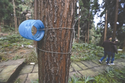 鼠害还引起了学界的关注。在洪雅林场野鸡坪一带的树干上,记者见到了四川大学生命科学学院团队设置的药效实验装置。类似洗衣机排水管一样的蓝色塑料硬管绑在离地一米多的树干上,管子的直径,正好可以容得下赤腹松鼠。有胃毒作用的不育剂放在管子里,诱使松鼠食用中毒。该方法还在实验阶段,因有一定的毒性对森林生态不利。