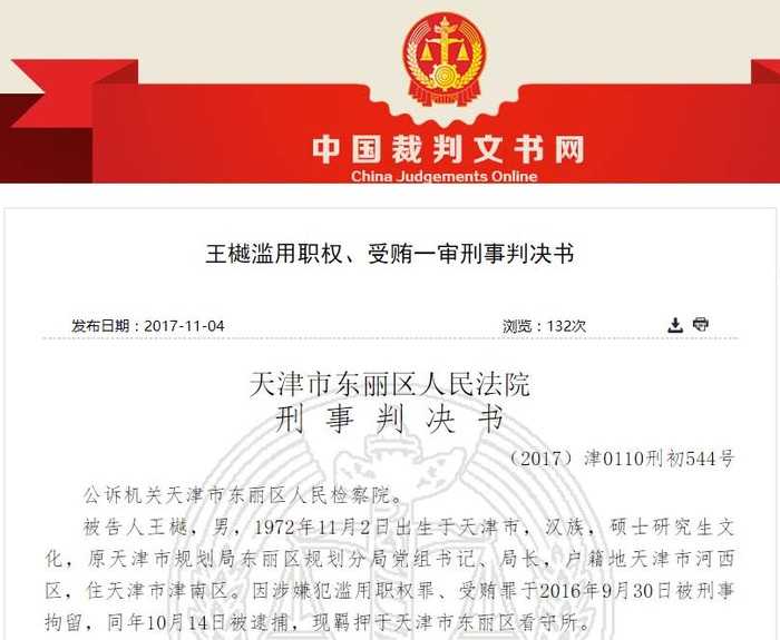 另外,中国裁判文书网近日还发布了天津市规划局东丽区规划分局原党组书记、局长王樾滥用职权、受贿一审刑事判决书。